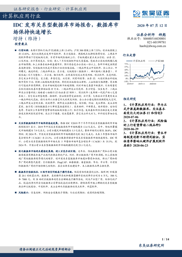 【东吴证券】【20200712】20200712-东吴证券-计算机应用行业跟踪周报:IDC发布关系型数据库市场报告,数据库市场保持快速增长-14页