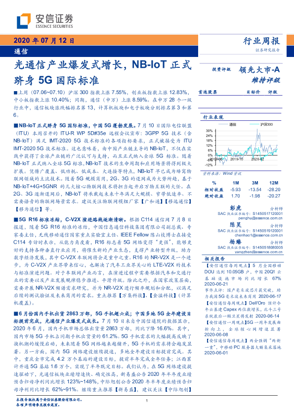 5G标准 NB-IoT 物联网 通信行业周报 光通信