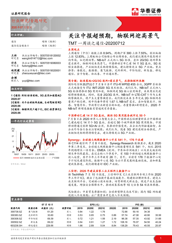 【华泰证券】【20200712】TMT一周谈之通信:关注中报超预期,物联网迎高景气-18页