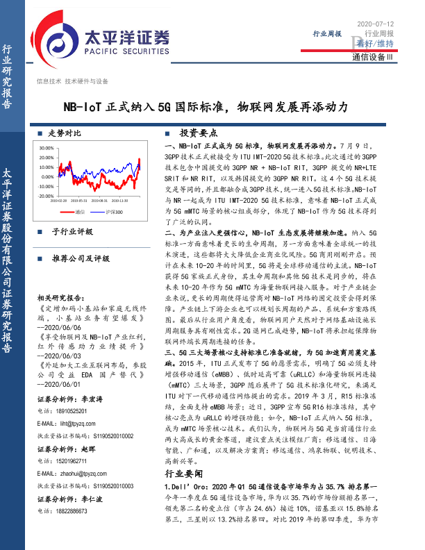 【太平洋证券】【20200712】20200712-太平洋-通信设备行业周报:NB-IoT正式纳入5G国际标准,物联网发展再添动力-13页