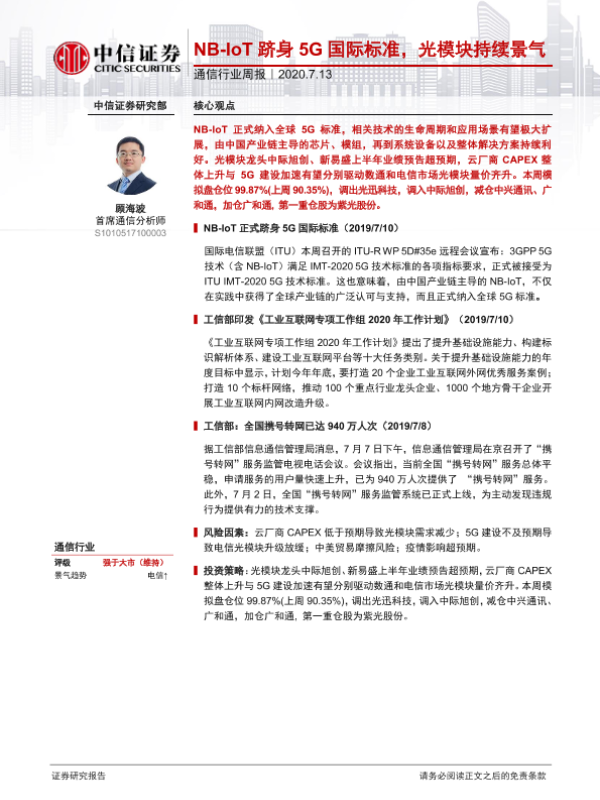 【中信证券】【20200713】20200713-中信证券-通信行业周报:NB-IoT跻身5G国际标准,光模块持续景气-9页