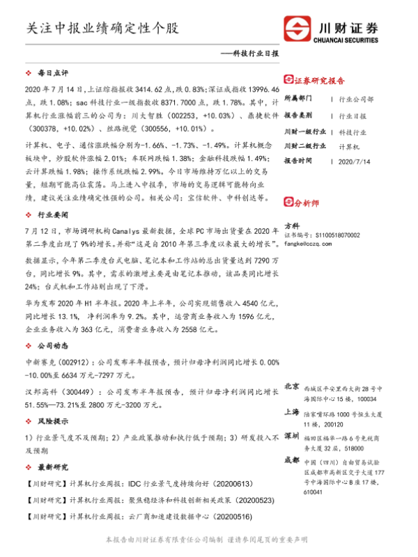 【川财证券】【20200714】科技行业日报:关注中报业绩确定性个股-3页