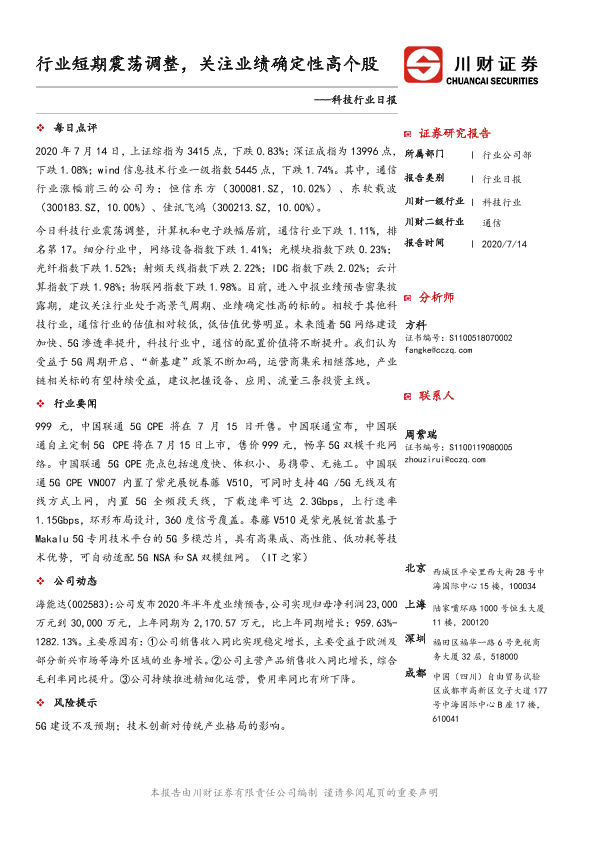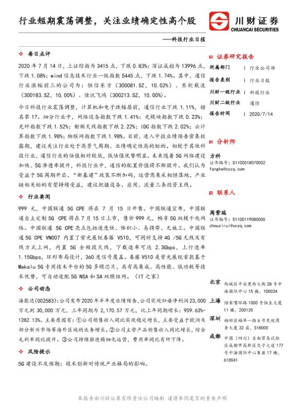 【川财证券】【20200714】科技行业日报:行业短期震荡调整,关注业绩确定性高个股-4页