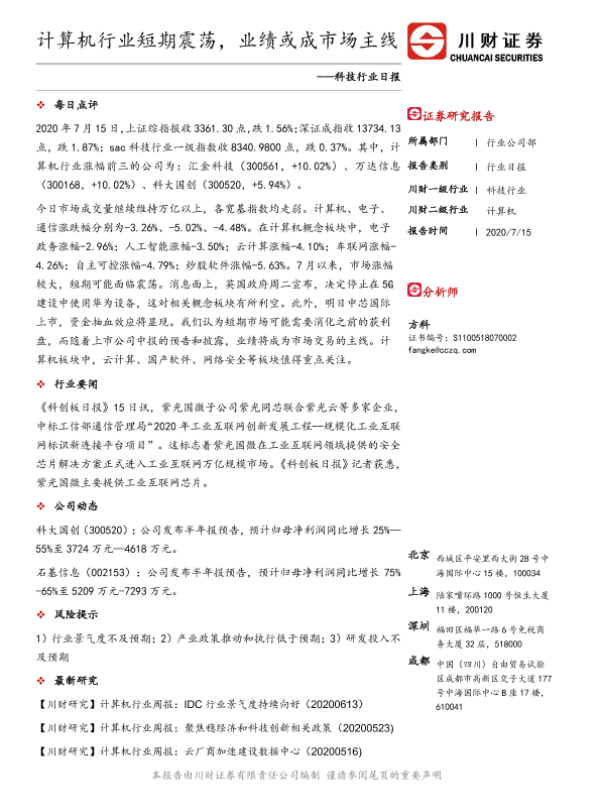 【川财证券】【20200715】科技行业日报:计算机行业短期震荡,业绩或成市场主线-3页