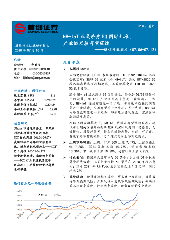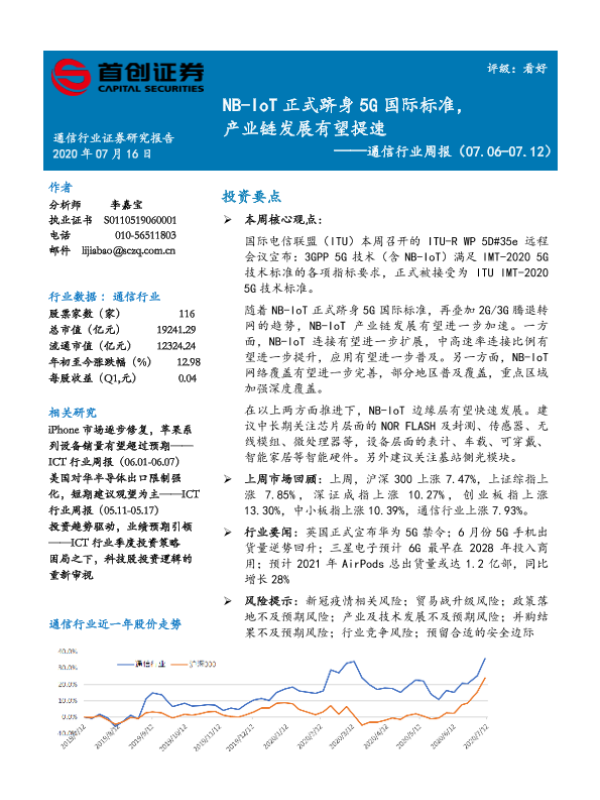 【首创证券】【20200716】通信行业周报:NB-IoT正式跻身5G国际标准,产业链发展有望提速-9页