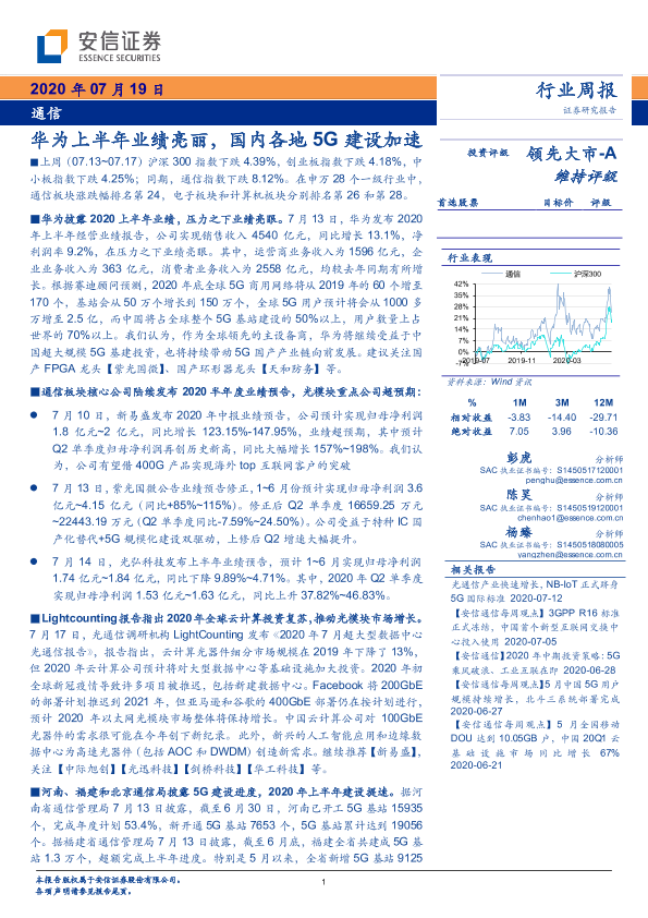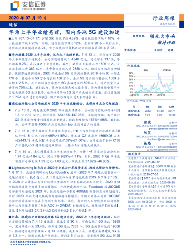 【安信证券】【20200719】20200719-安信证券-通信行业周报:华为上半年业绩亮丽,国内各地5G建设加速-13页
