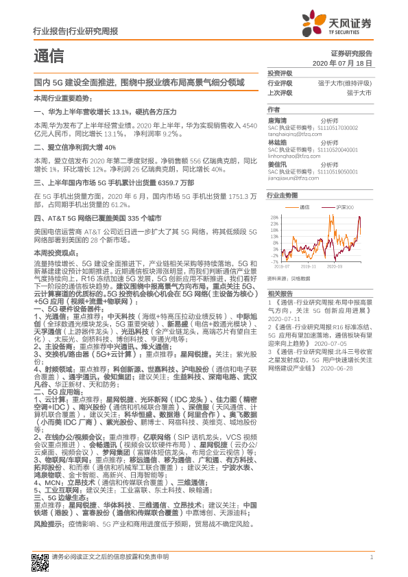 【天风证券】【20200718】20200718-天风证券-通信行业研究周报:国内5G建设全面推进,围绕中报业绩布局高景气细分领域-17页