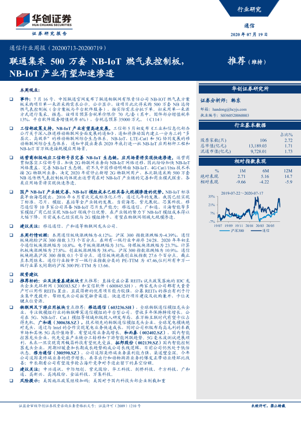 【华创证券】【20200719】通信行业周报:联通集采500万套NB-IoT燃气表控制板,NB-IoT产业有望加速渗透-18页