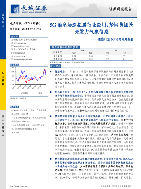 【长城证券】【20200719】通信行业5G消息专题报告:5G消息加速拓展行业应用,梦网集团抢先发力气象信息-17页