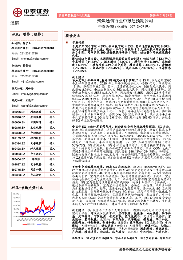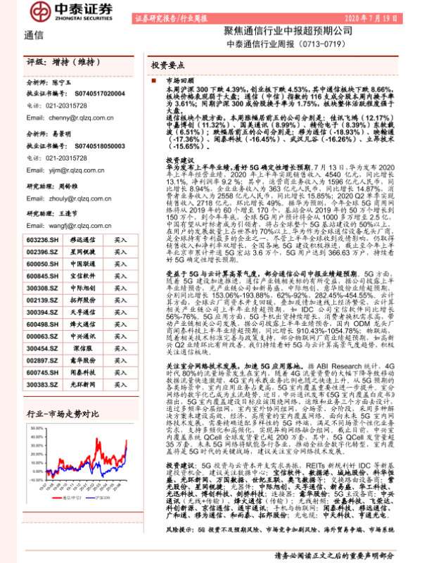 【中泰证券】【20200719】通信行业周报:聚焦通信行业中报超预期公司-17页