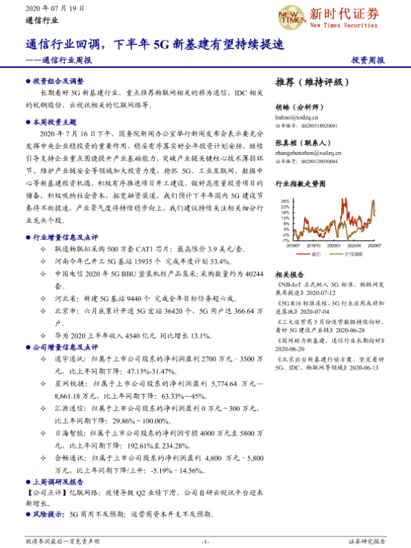 【新时代证券】【20200719】通信行业周报:通信行业回调,下半年5G新基建有望持续提速-20页