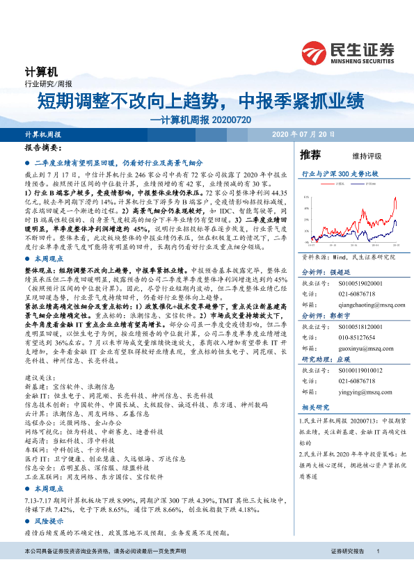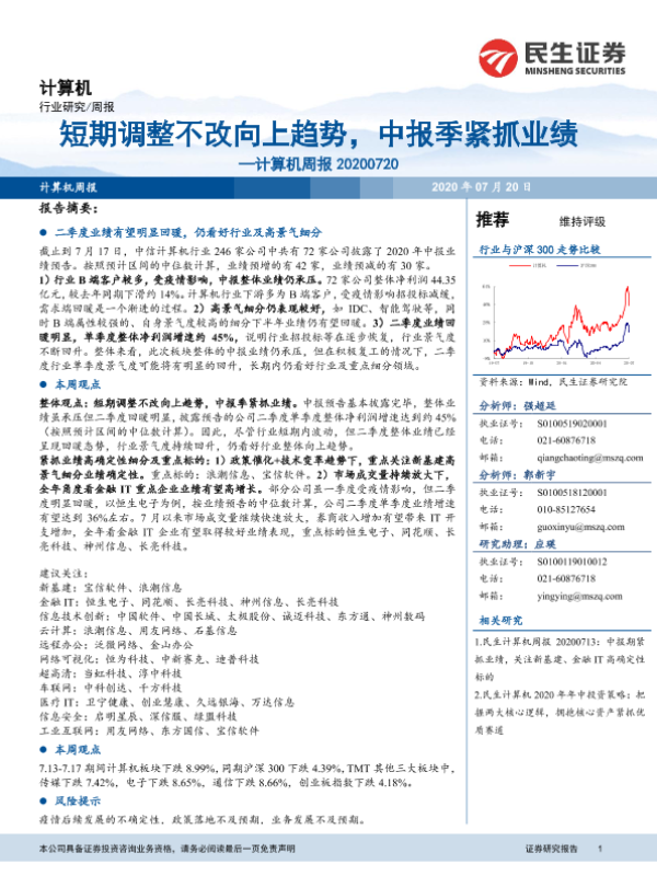【民生证券】【20200720】20200720-民生证券-计算机周报:短期调整不改向上趋势,中报季紧抓业绩-17页