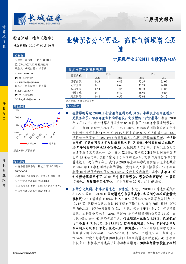 【长城证券】【20200720】计算机行业2020H1业绩预告总结:业绩预告分化明显,高景气领域增长提速-16页