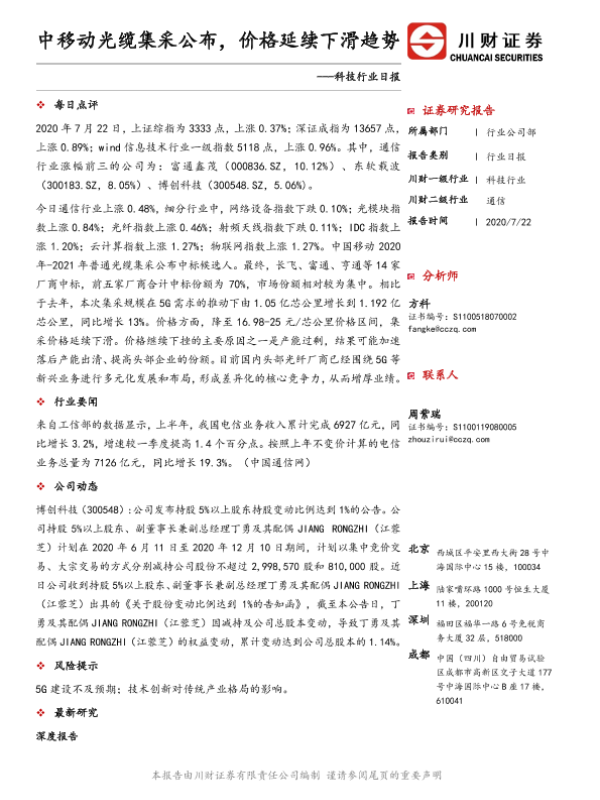 【川财证券】【20200722】科技行业日报:中移动光缆集采公布,价格延续下滑趋势-4页