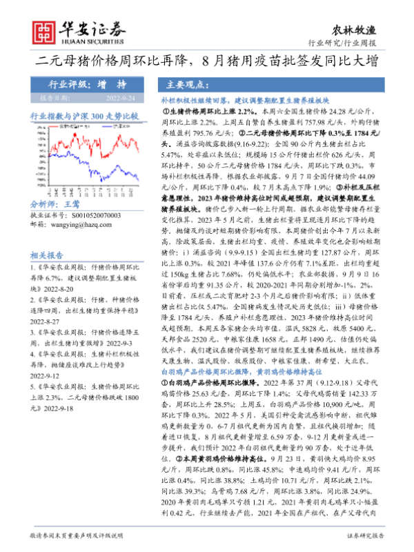【华安证券】【20220924】农林牧渔行业周报:二元母猪价格周环比再降,8月猪用疫苗批签发同比大增-40页