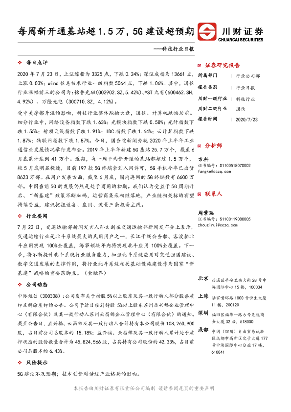 【川财证券】【20200723】每周新开通基站超1.5万,5G建设超预期-4页