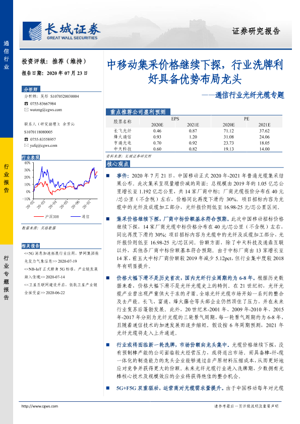 【长城证券】【20200723】通信行业光纤光缆专题:中移动集采价格继续下探,行业洗牌利好具备优势布局龙头-13页