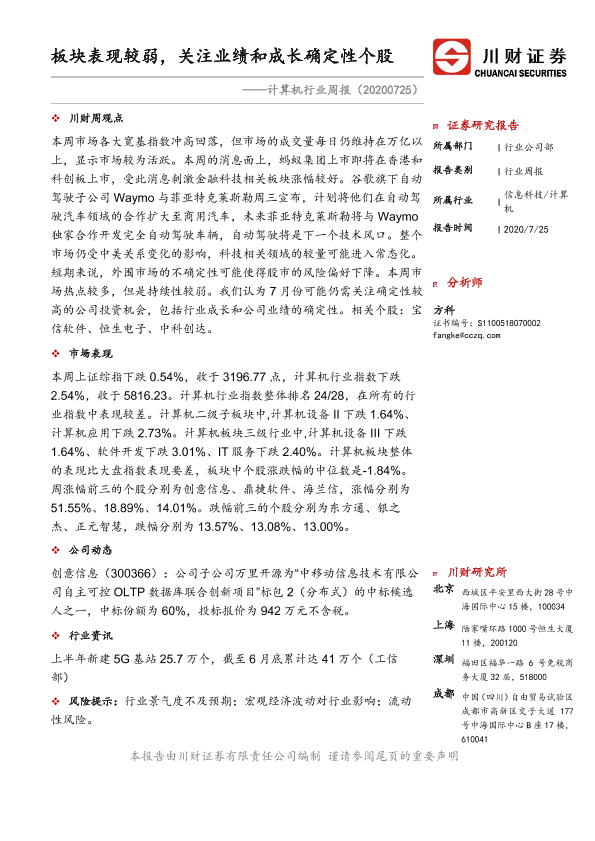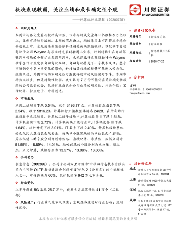 【川财证券】【20200725】20200725-川财证券-计算机行业周报:板块表现较弱,关注业绩和成长确定性个股-9页