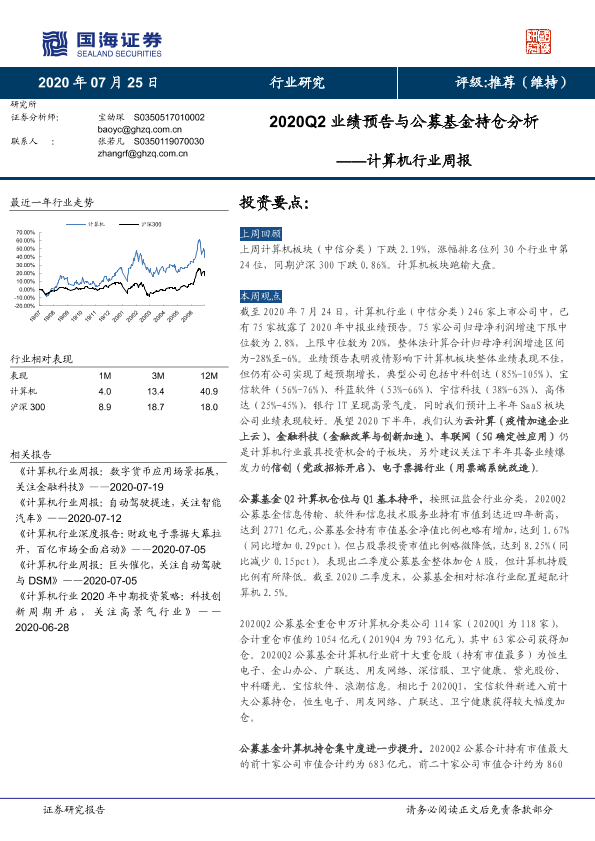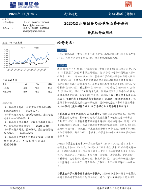 2020Q2 业绩预告 公募基金持仓 行业周报 计算机行业