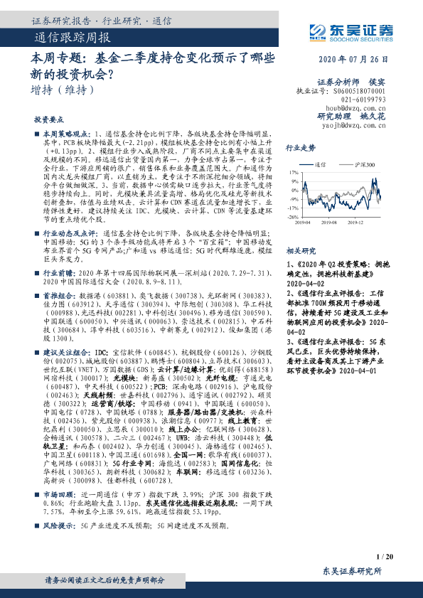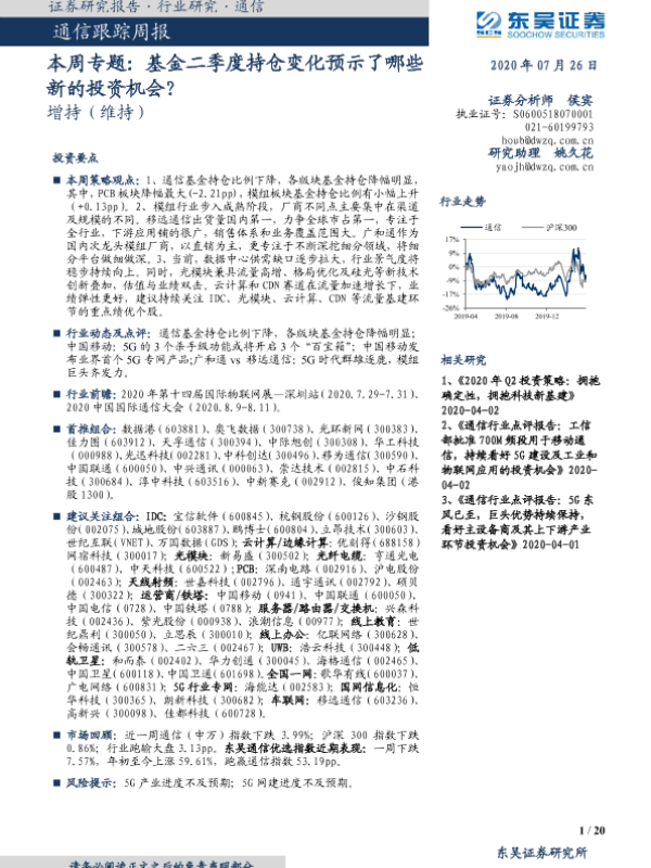 【东吴证券】【20200726】20200726-东吴证券-通信跟踪周报-本周专题:基金二季度持仓变化预示了哪些新的投资机会?-20页