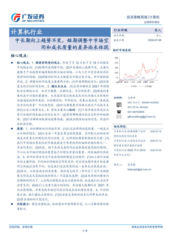 【广发证券】【20200726】计算机行业:中长期向上趋势不变,短期调整中市场空间和成长质量的差异尚未体现-8页