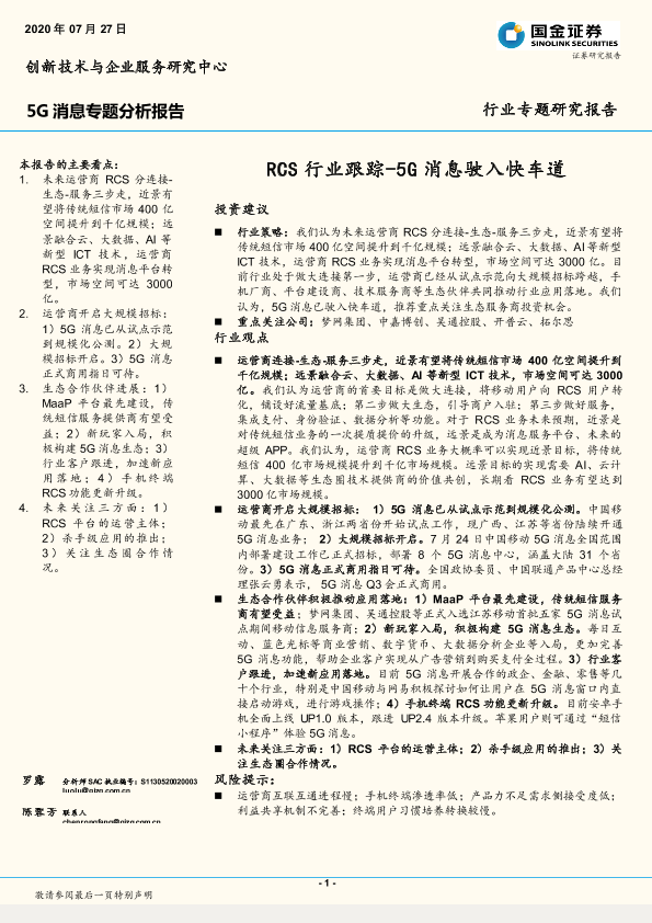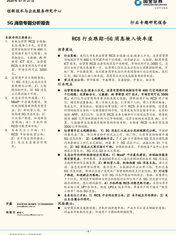 【国金证券】【20200727】20200727-国金证券-5G消息专题分析报告:RCS行业跟踪-5G消息驶入快车道-9页