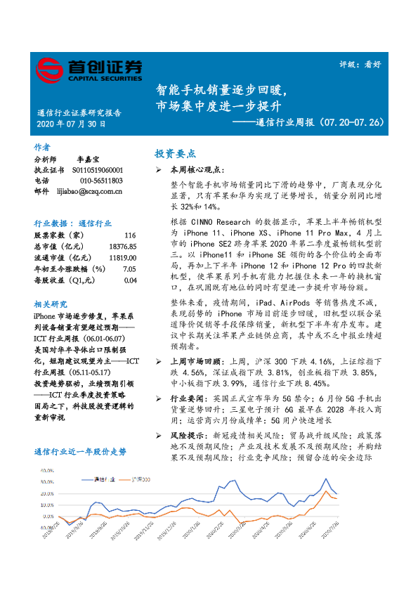 【首创证券】【20200730】20200730-首创证券-通信行业周报:智能手机销量逐步回暖,市场集中度进一步提升-9页