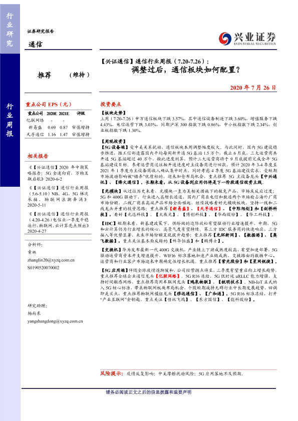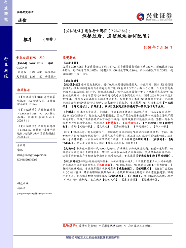 【兴业证券】【20200726】【兴证通信】通信行业周报(7.20-7.26):调整过后,通信板块如何配置?-8页
