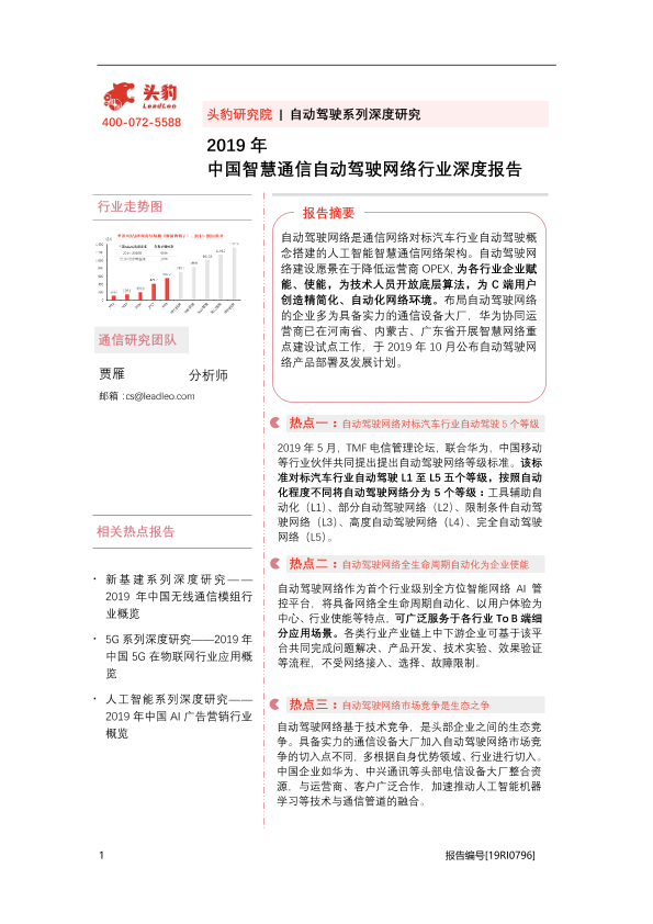 【头豹研究院】【2019】2019年中国智慧通信自动驾驶网络行业深度报告-33页