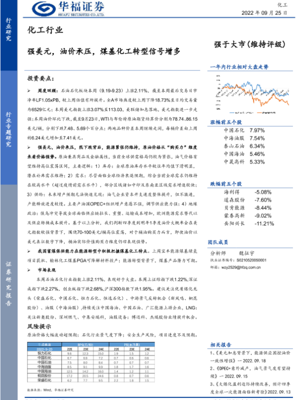 【华福证券】【20220925】化工行业:强美元,油价承压,煤基化工转型信号增多-18页