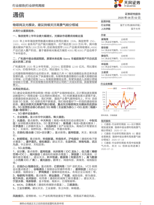 【天风证券】【20200802】20200802-天风证券-通信行业研究周报:物联网及光模块,建议持续关注高景气细分领域-14页