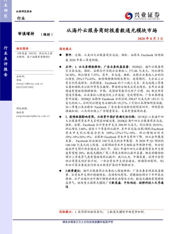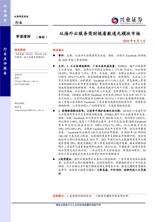 【兴业证券】【20200803】从海外云服务商财报看数通光模块市场-2页