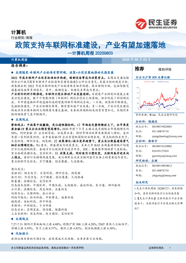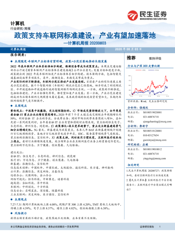 【民生证券】【20200803】20200803-民生证券-计算机周报:政策支持车联网标准建设,产业有望加速落地-19页