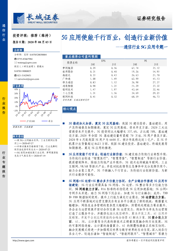 【长城证券】【20200803】通信行业5G应用专题一:5G应用使能千行百业,创造行业新价值-23页