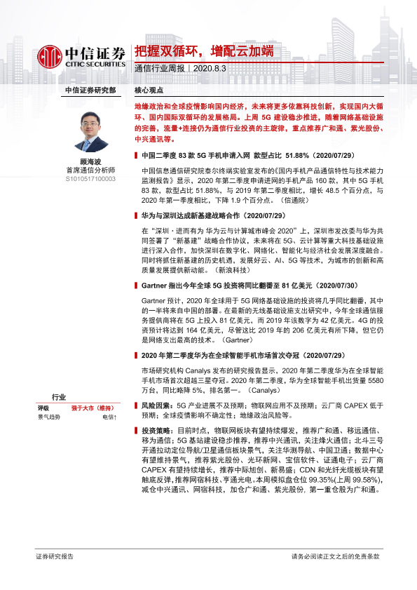 【中信证券】【20200803】通信行业周报:把握双循环,增配云加端-9页