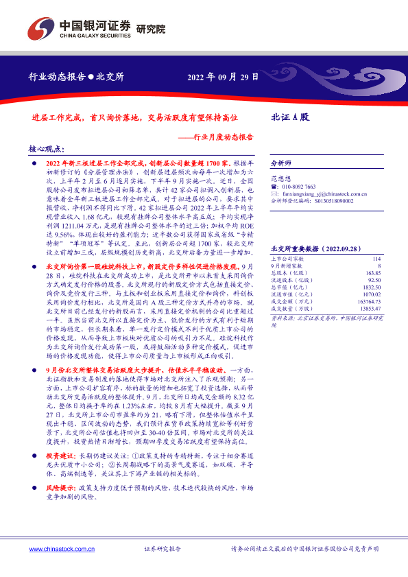 【银河证券】【20220929】北证A股行业月度动态报告:进层工作完成,首只询价落地,交易活跃度有望保持高位-22页