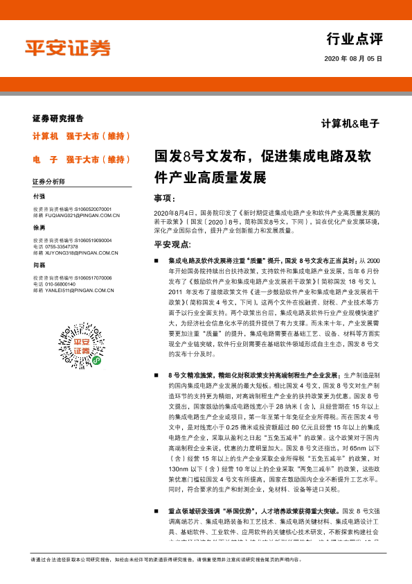【平安证券】【20200805】计算机&电子行业点评:国发8号文发布,促进集成电路及软件产业高质量发展-3页