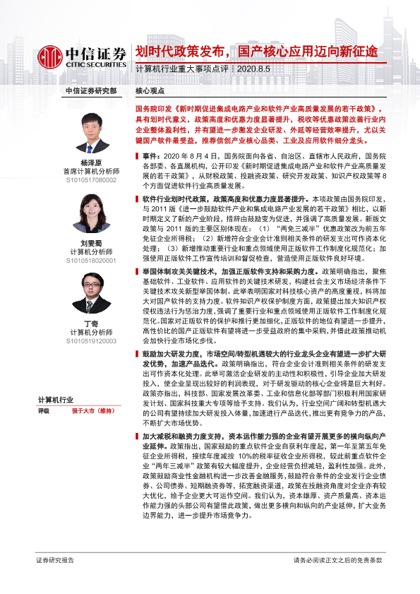 【中信证券】【20200805】计算机行业重大事项点评:划时代政策发布,国产核心应用迈向新征途-3页
