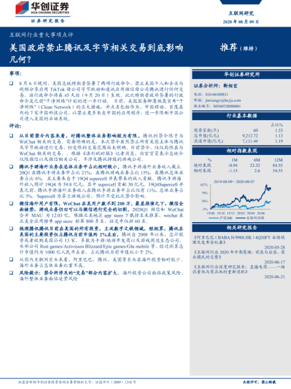 【华创证券】【20200809】互联网行业重大事项点评:美国政府禁止腾讯及字节相关交易到底影响几何?-10页