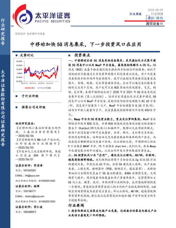 【太平洋证券】【20200809】20200809-太平洋-通信设备Ⅲ行业周报:中移动加快5G消息集采,下一步投资风口在应用-14页