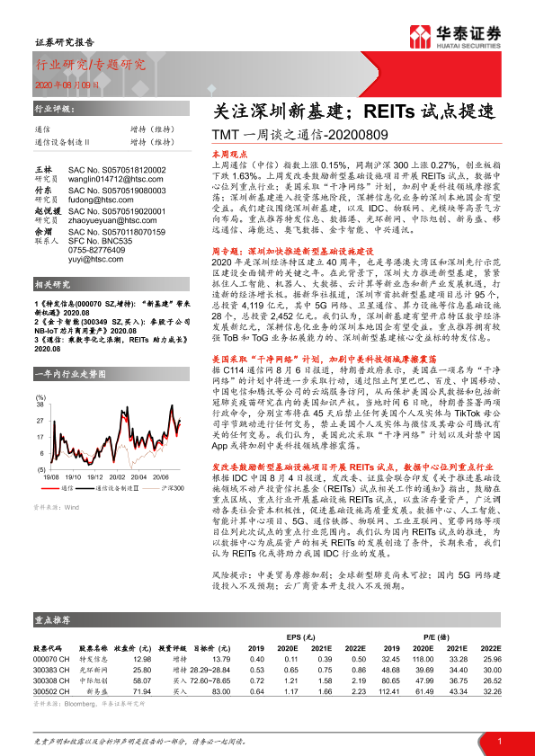 【华泰证券】【20200809】20200809-华泰证券-TMT一周谈之通信:关注深圳新基建;REITs试点提速-19页