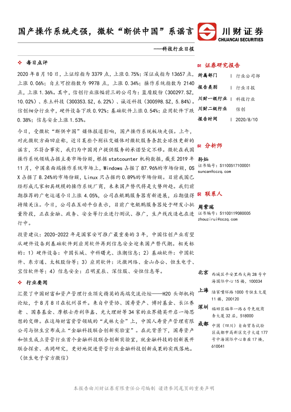 【川财证券】【20200810】科技行业日报:国产操作系统走强,微软“断供中国”系谣言-3页