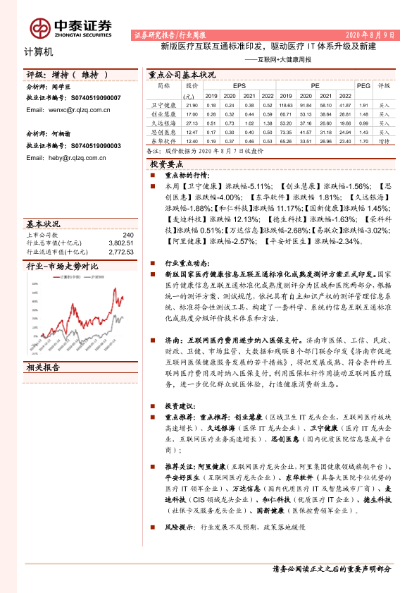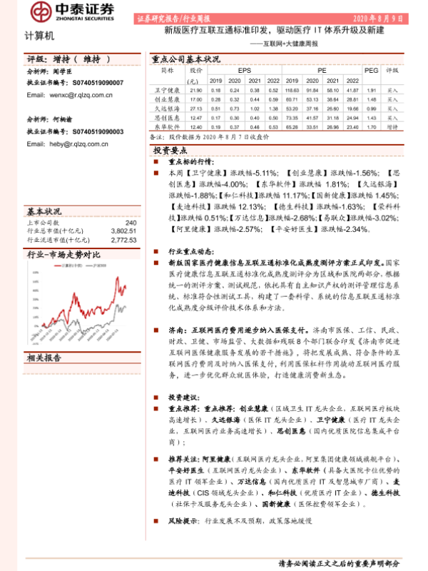 【中泰证券】【20200809】互联网+大健康周报:新版医疗互联互通标准印发,驱动医疗IT体系升级及新建-9页