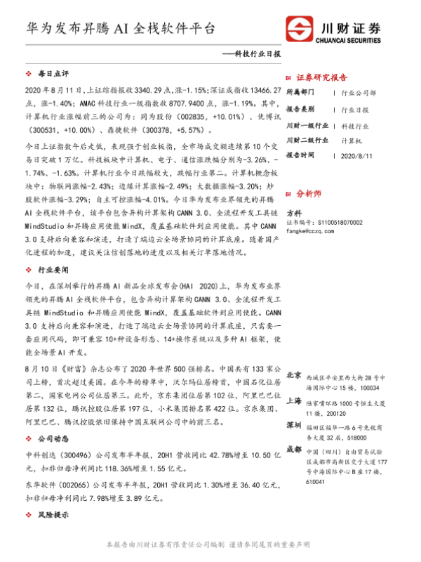 【川财证券】【20200811】科技行业日报:华为发布昇腾AI全栈软件平台-3页