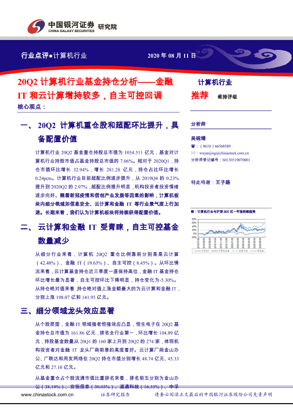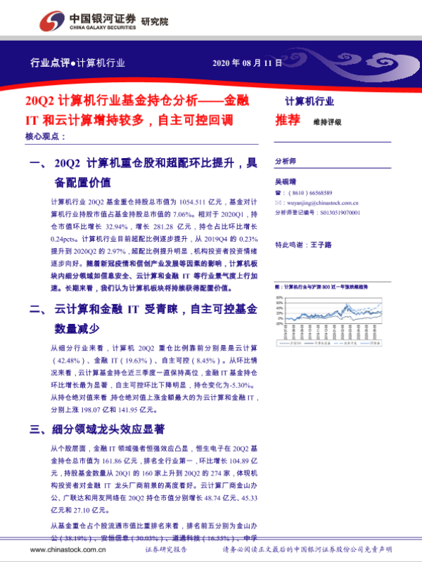 【银河证券】【20200811】20Q2计算机行业基金持仓分析:金融IT和云计算增持较多,自主可控回调-13页