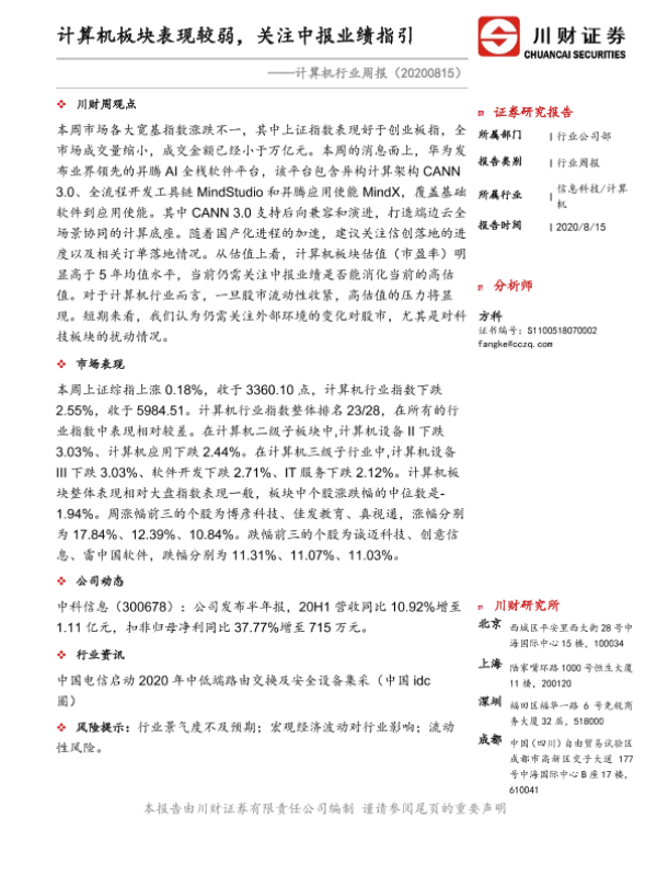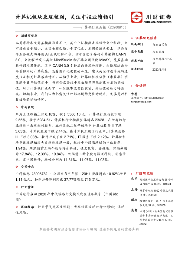 【川财证券】【20200815】计算机行业周报:计算机板块表现较弱,关注中报业绩指引-8页