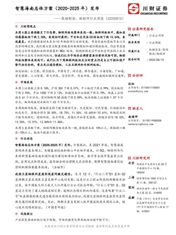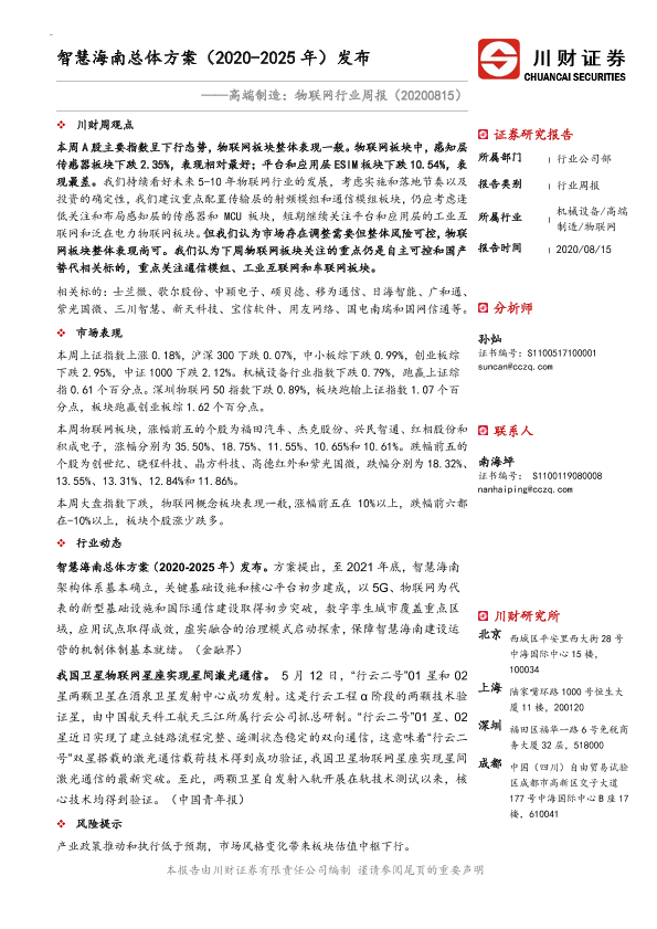 【川财证券】【20200815】高端制造:物联网行业周报:智慧海南总体方案(2020-2025年)发布-18页