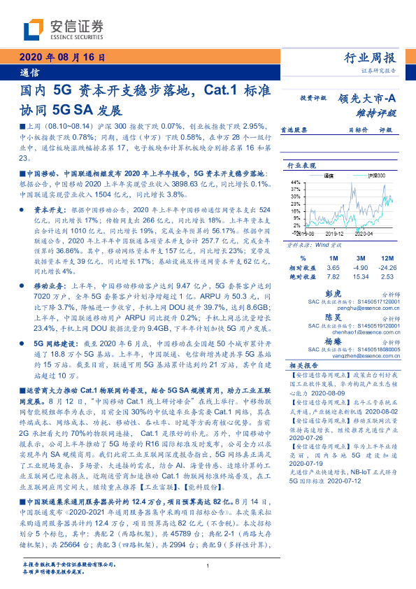 【安信证券】【20200816】通信行业周报:国内5G资本开支稳步落地,Cat.1标准协同5G SA发展-9页