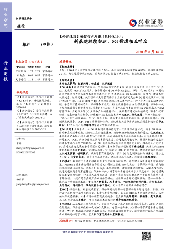 【兴业证券】【20200816】【兴证通信】通信行业周报(8.10-8.16):新基建继续加速,5G数通相互呼应-7页