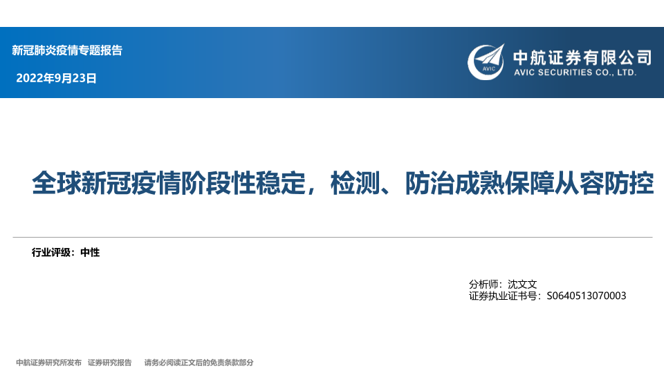 【中航证券】【20220923】医药行业新冠肺炎疫情专题报告:全球新冠疫情阶段性稳定,检测、防治成熟保障从容防控-63页